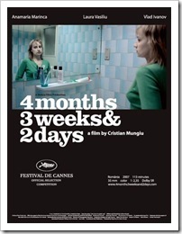 Filmul 4 luni, 3 săptămâni şi 2 zile, în regia lui Cristian Mungiu, a fost câştigătorul Marelui Premiu al Festivalului de la Cannes pe anul 2007. Am profitat de ocazia ce mi se ivise şi m-am dus să îl văd cu un oarecare entuziasm; era doar un film românesc ce câştigase un premiu de excepţie, ce reuşise să se facă remarcat peste hotarele ţării.