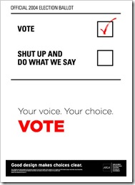 Trecând iarăşi prin goana mea prin internet mi-a atras atenţia această pagină, ce dă nişte exemple prin intermediul unor postere asupra a cum designul unei campanii te poate determina să-ţi întorci privirea în direcţia aceea. Posterele pe care le prezintă acest site îndeamnă populaţia să meargă la vot, pe principiul că singura alegere bună este aceea pe care o faci tu. Am selecţionat şi eu trei dintre acele imagini, pe care le puteţi vedea mai jos.